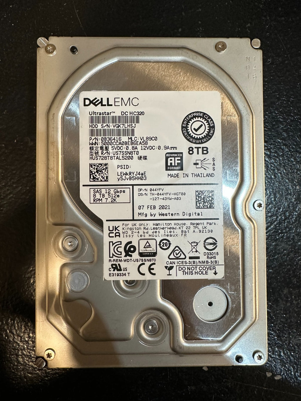 44YFV DELL EMC 8TB 7.2K 12Gbps ENT SAS 3.5in 512e HDD 044YFV HUS728T8TAL5200