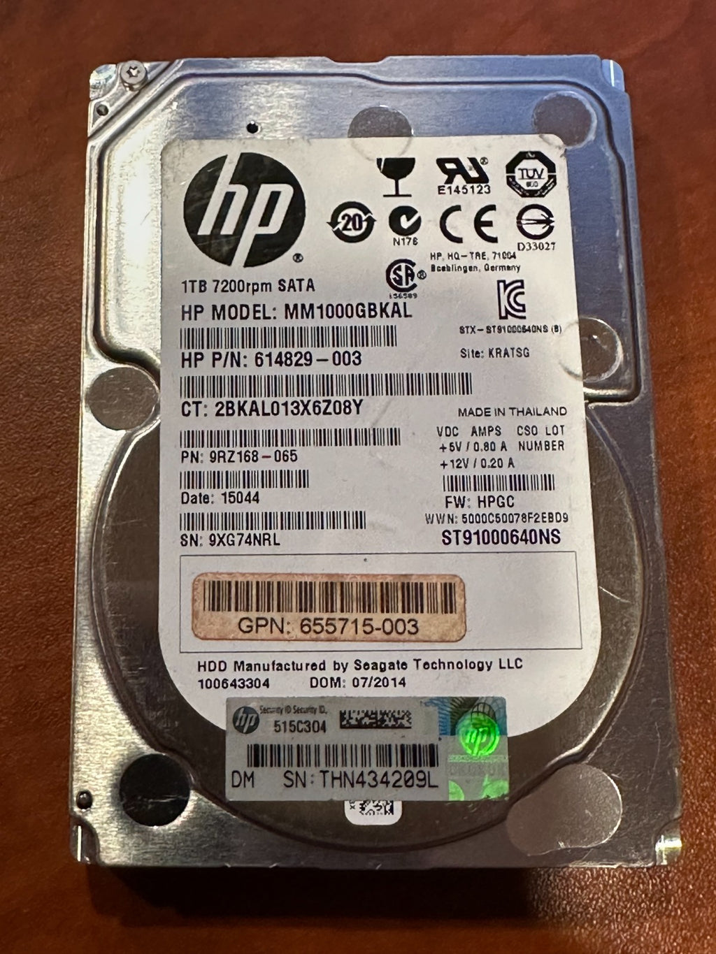 For sale is an HP 1TB 7200RPM SATA Enterprise HDD, HP Model MM1000GBKAL, manufactured by Seagate (model ST91000640NS).